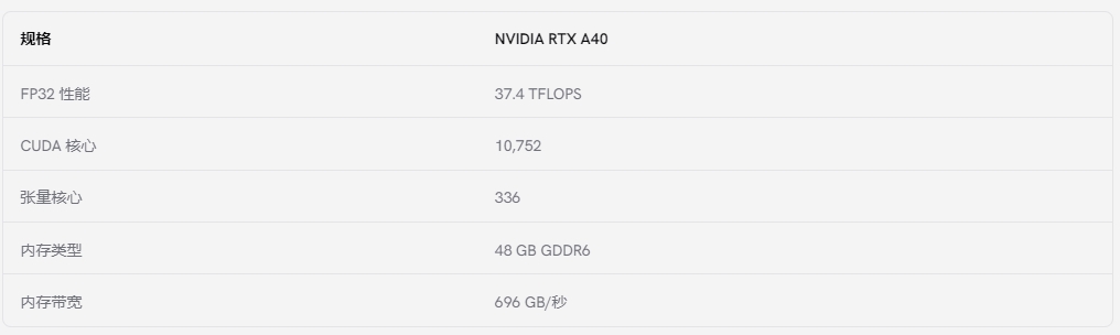 NVIDIA RTX A40 提供 37.4 teraflops 的 FP32(单精度浮点)性能,配备 10,752 个 CUDA 核心,可实现并行计算。此外,它还包含 336 个专为深度学习性能而设计的 Tensor Core。它还配备了 48 GB 的 GDDR6 内存,可提供 696 GB/s 的带宽。如此巨大的内存池和高带宽可有效处理大型数据集和复杂的 AI 模型。