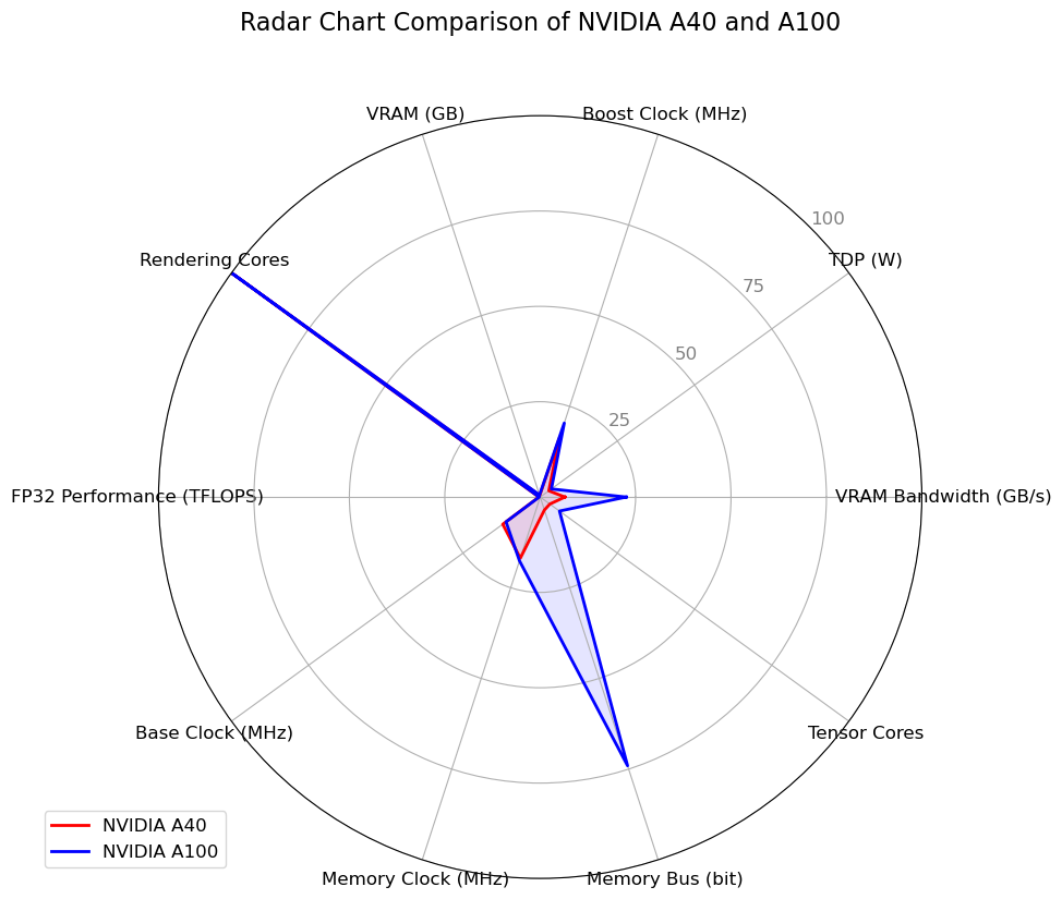 不过,A40 确实有其优势。它具有更高的加速时钟、更大的 VRAM 和更多的渲染核心,这使其成为需要高内存容量和快速渲染的任务(例如 3D 建模)的更好选择。