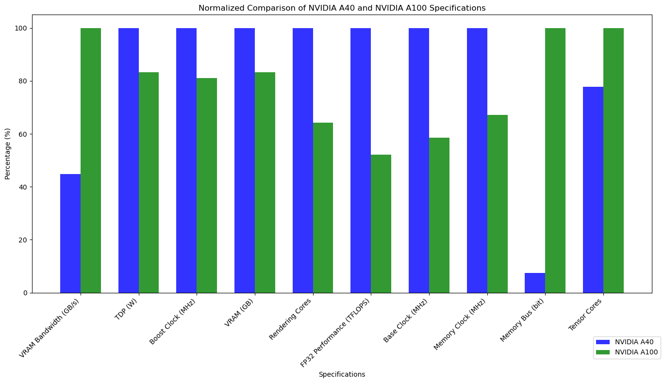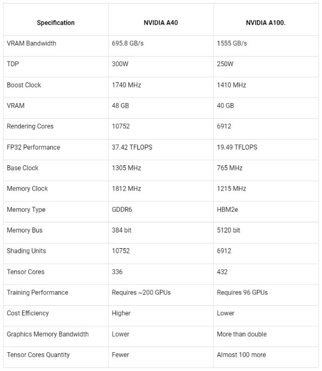 在成本效益方面,A40 更高,这意味着它可以根据具体的工作负载提供每美元花费的更高性能。