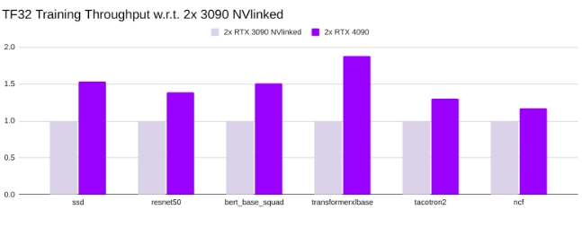 最后但同样重要的一点是,我们将2x RTX 4090与2x RTX 3090 ( 使用 NVLink)进行了比较,发现2x RTX 4090 的表现始终优于2x RTX 3090 :