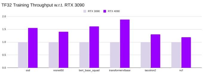 • RTX 4090的训练吞吐量明显更高。根据型号不同,其TF32训练吞吐量比RTX 3090高出1.3 倍至1.9 倍。