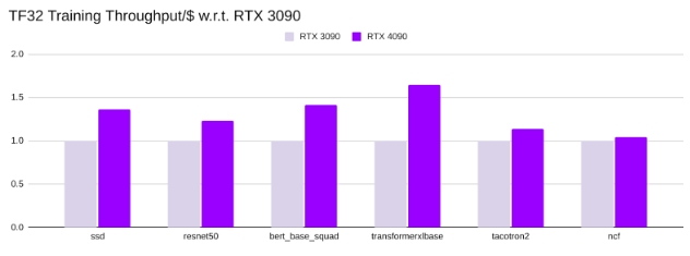 • 在我们测试的深度学习模型中,包括视觉、语言、语音和推荐系统中的用例,RTX 4090的训练吞吐量和训练吞吐量/$明显高于RTX 3090 。