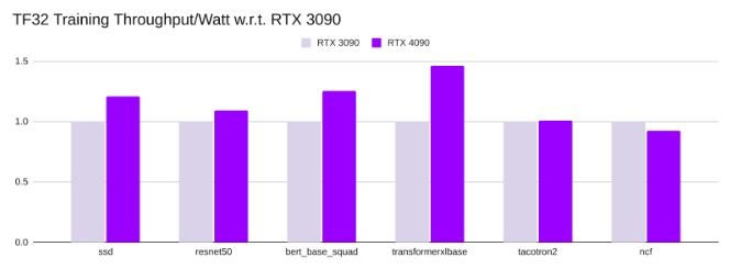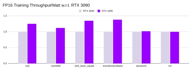 • RTX 4090的训练吞吐量/瓦特与RTX 3090相当,范围在RTX 3090 的0.92 倍到1.5 倍之间。
