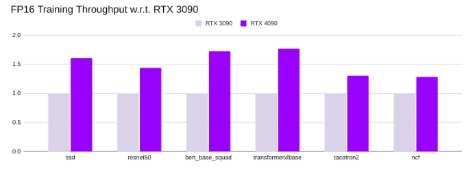 • 同样,RTX 4090的FP16训练吞吐量比RTX 3090高1.3 倍到1.8 倍。