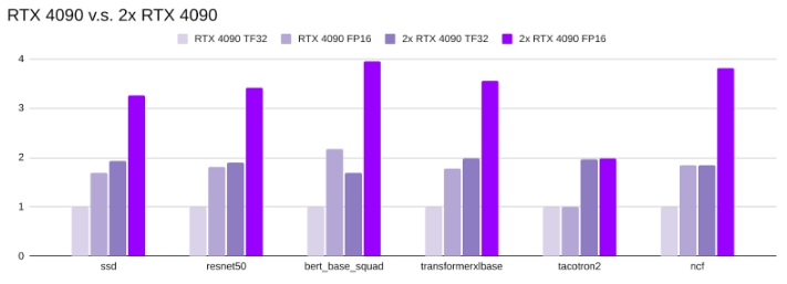我们的测试表明,RTX 4090在 2x GPU 深度学习训练中表现相当不错: