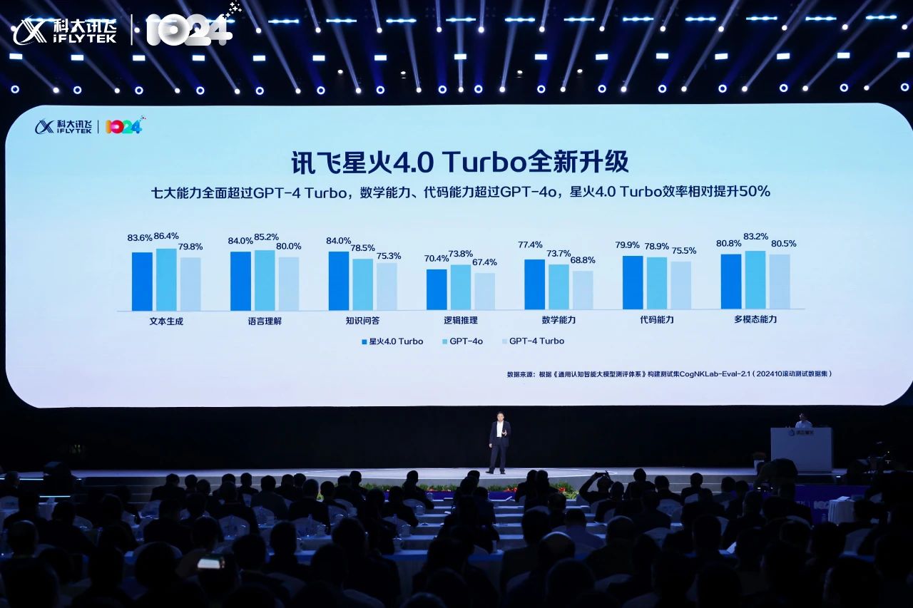 10月24日,第七届世界声博会暨2024科大讯飞全球1024开发者节开幕,科大讯飞董事长刘庆峰发布讯飞星火4.0 Turbo:七大核心能力全面超过GPT-4 Turbo,数学和代码能力超越GPT-4o,国内外中英文14项主流测试集中实现了9项第一。讯飞星火4.0 Turbo,在数学能力、代码能力上超过了GPT-4o。由艾伦人工智能研究所、OpenAI等国内外权威单位发布,涵盖理解和推理、综合考试、数学和科学、代码等不同任务类型的14项主流测试集中,讯飞星火4.0 Turbo在其中9项测试集中实现超越,效率相对提升50%。