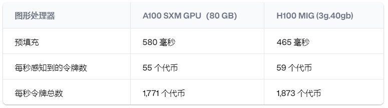 我们使用的 H100 GPU 的Fractional计算能力是完整 H100 GPU 的七分之三,内存是完整 H100 GPU 的一半。但这些规格与 A100 GPU 相比如何?